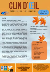 Clin d’Œil est le journal d’informations et d’expression des adhérents du Centre Social. Il est publié quatre fois par an grâce à un comité de rédaction bénévole. Jetez un coup d’œil en le téléchargeant directement sur votre ordinateur !